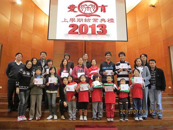 典禮已接近尾聲,最後頒發的為愛育學校的獎學金(獎狀與獎金),得獎的同學皆因去年101學年度的中文成績與西文成績達到優良標準,共有十三位獲此殊榮(三位提交與阿根廷教會頒發此獎項、殊榮)。
